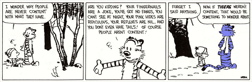 One that caught my eye in one the books a while back: ![]() My apologies to Bill Watterson, but I just had to make a slight modification to illustrate one of the things I see in this strip: http://mikkowilson.com/files/CH_PeopleNeverContent2.jpg - Mikko
